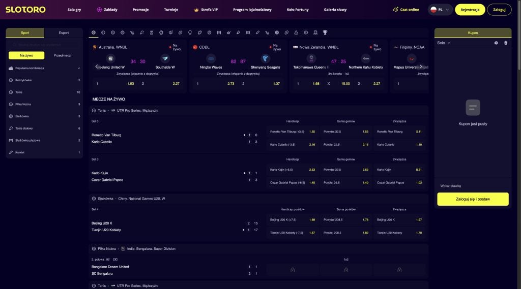 Slotoro oferuje zakłady na popularne dyscypliny i nie tylko. Obstawisz tutaj mecze piłki nożnej, tenisa ziemnego, koszykówki, hokeja na lodzie i wielu innych sportów. Łącznie to ponad 20 dyscyplin. Do wyboru są także polskie rozgrywki, jak chociażby piłkarska Ekstraklasa. Najpopularniejsze mecze gwarantują wybór nawet kilkuset rynków bukmacherskich. Możesz je typować przedmeczowo i na żywo.